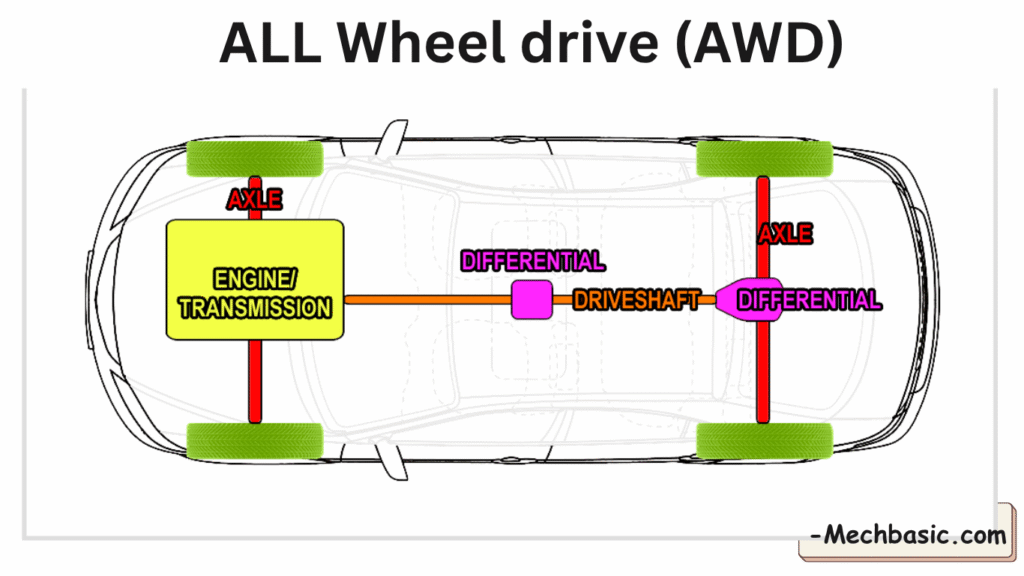 All-Wheel Drive (AWD) = engine → transmission → center differential → front & rear differentials → all wheels.