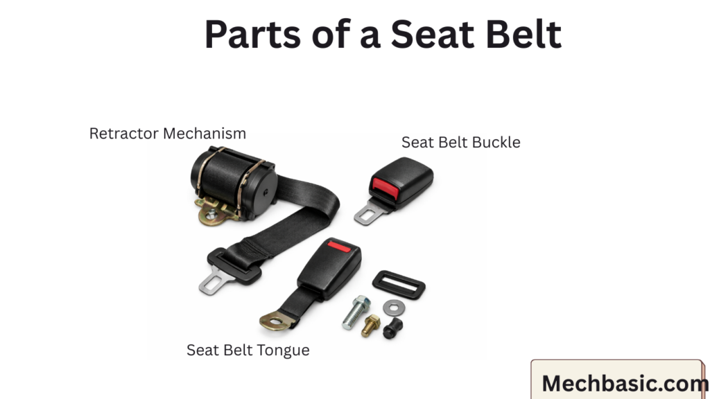 A seatbelt has several key parts that work together to keep passengers safe.Main components include the webbing (strap), tongue (metal