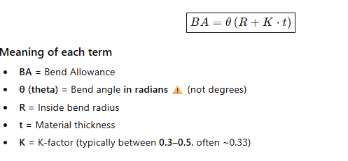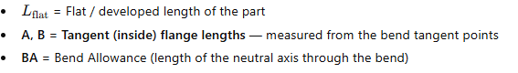 | Bend Allowance (BA) | Length of material along neutral axis consumed in the bend |