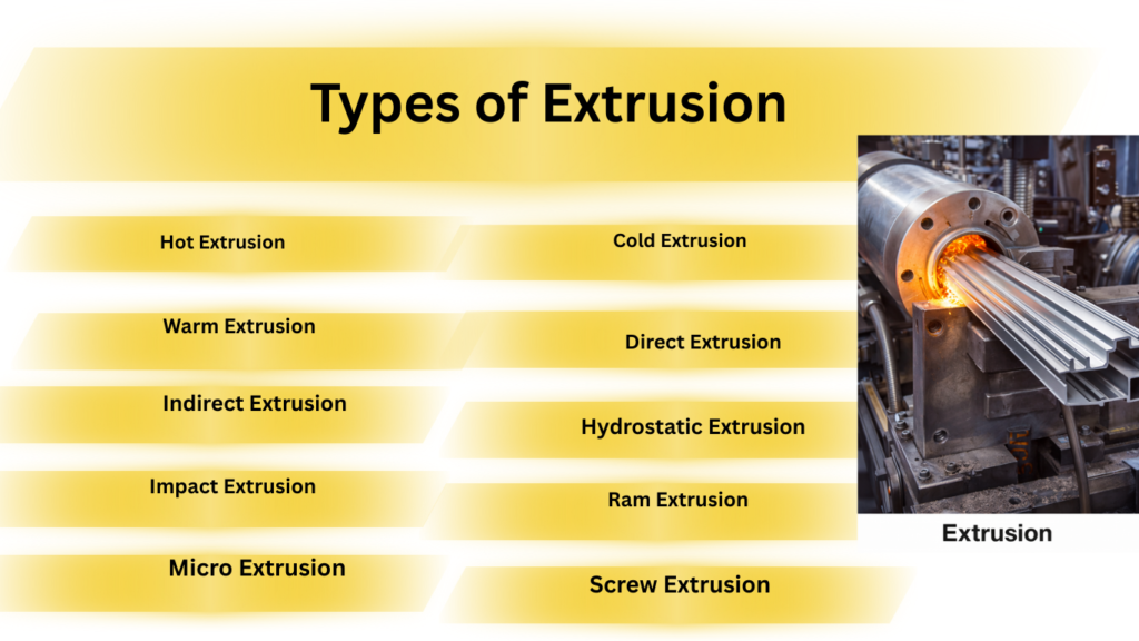 Types of Extrusion Extrusion processes are classified based on temperature, direction of material flow, working principle, and application. Each type