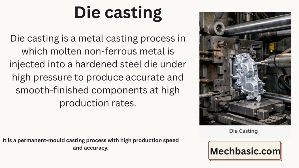 Below is a complete, structured, exam-ready explanation of DIE CASTING, written in clear technical language and suitable for manufacturing / mechanical engineering students, interviews, and shop-floor understanding.