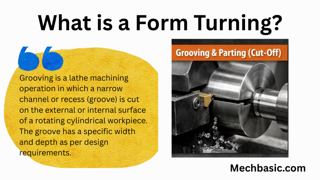 Grooving is a turning operation in which a narrow cutting tool is used to create a recessed channel or groove on the surface of a rotating workpiece. The tool is fed radially or axially to a specified depth and width.