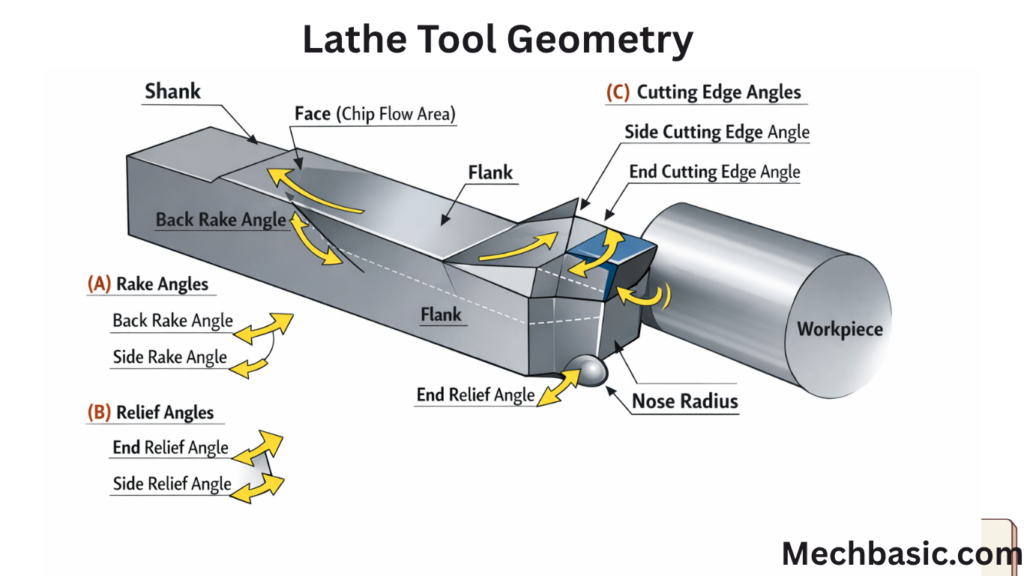 Lathe tool geometry is all about how the cutting tool is shaped and oriented so it cuts material efficiently, produces a good surface finish, and lasts longer. Let’s break it down clearly and in detail.