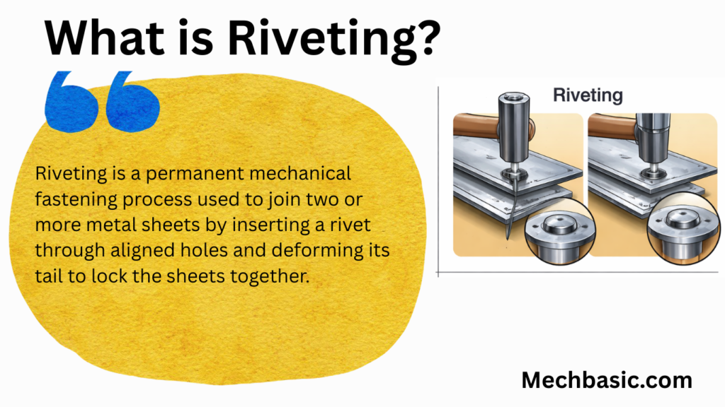 Riveting is a permanent mechanical fastening process used to join two or more metal sheets by inserting a rivet through aligned holes and deforming its tail to lock the sheets together.
