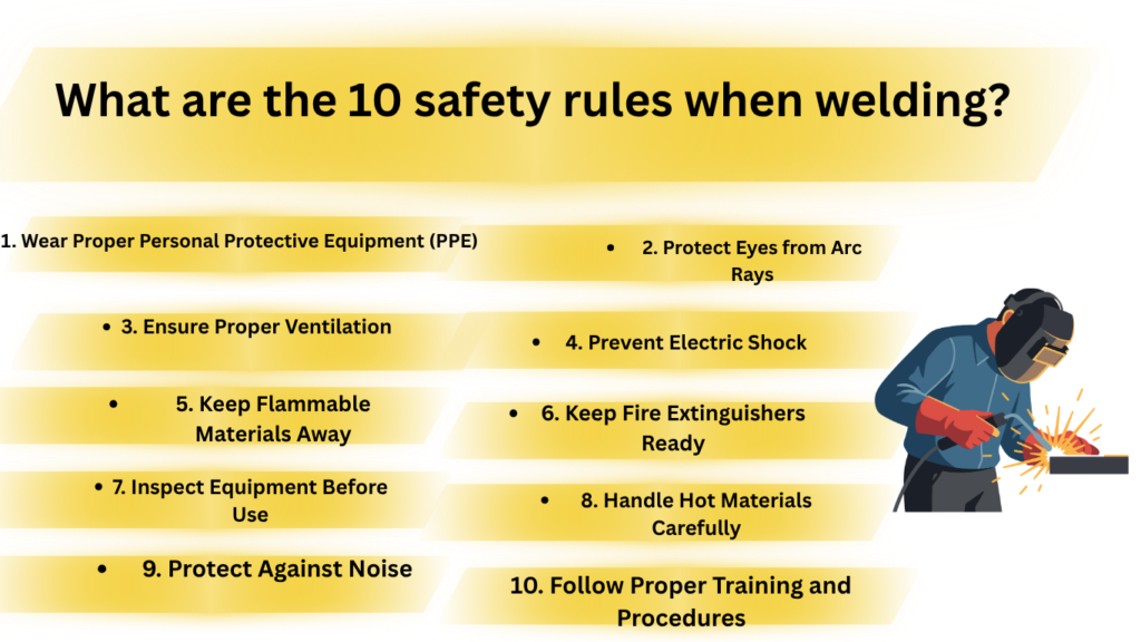 Ten key welding safety rules include wearing proper PPE, ensuring good ventilation, checking equipment, and avoiding flammable materials nearby.