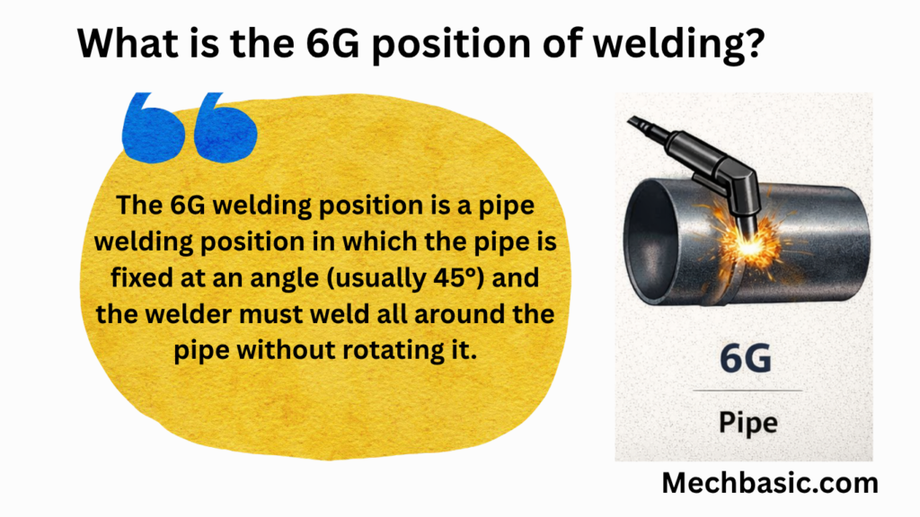 The 6G welding position is a pipe welding position in which the pipe is fixed at an angle (usually 45°) and the welder must weld all around the pipe without rotating it.