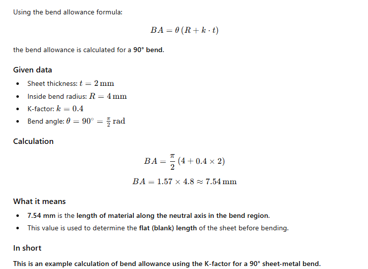 - Determines bend allowance (BA): material length along neutral axis consumed in bending.