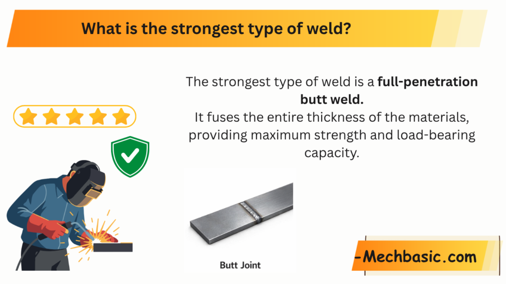 The strongest type of weld is a full-penetration butt weld.