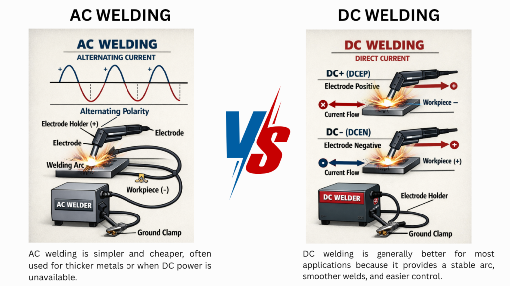 • DC welding: More versatile, stable, smooth, and generally preferred for most metals and beginners.